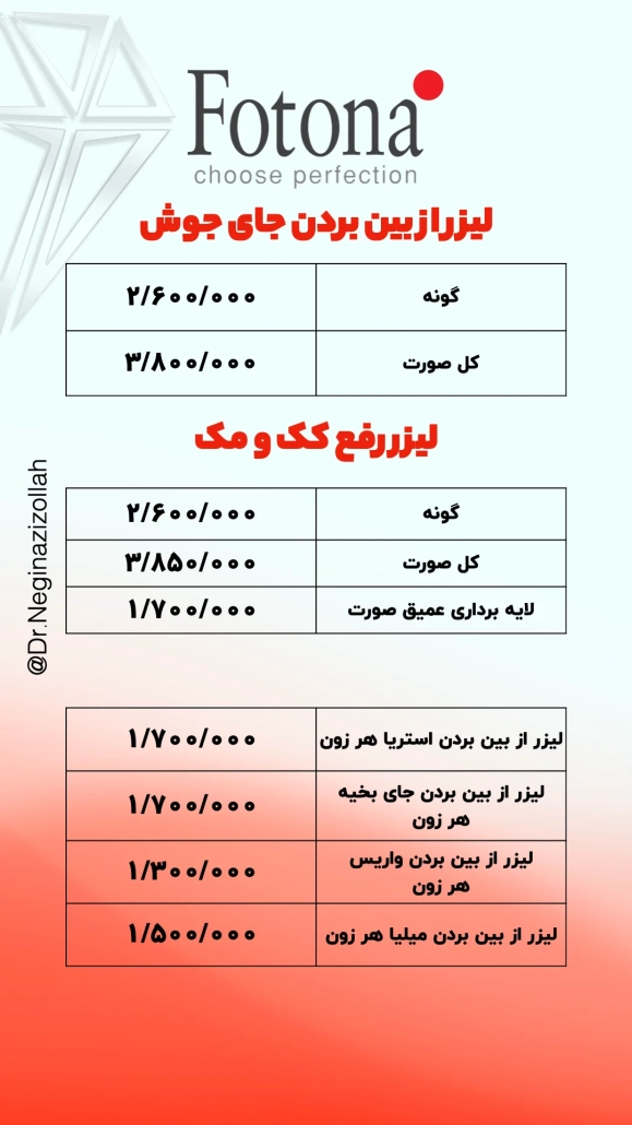 تعرفه لیزر فوتونا معمولاً به صورت یک جدول مشخص در کلینیکهای تخصصی ارائه میشود که شامل قیمتهای تفکیکشده برای هر نوع درمان یا ناحیه خاصی است. این تعرفه به مراجعین کمک میکند تا قبل از انجام هرگونه اقدام، دید واضحی از هزینههای مرتبط با خدمات فوتونا داشته باشند. شفافیت در ارائه تعرفه، نشانهای از صداقت و حرفهای بودن یک مرکز درمانی است و به بیماران امکان میدهد تا با مقایسه قیمتها و خدمات، بهترین گزینه را متناسب با بودجه و نیازهای خود انتخاب کنند.